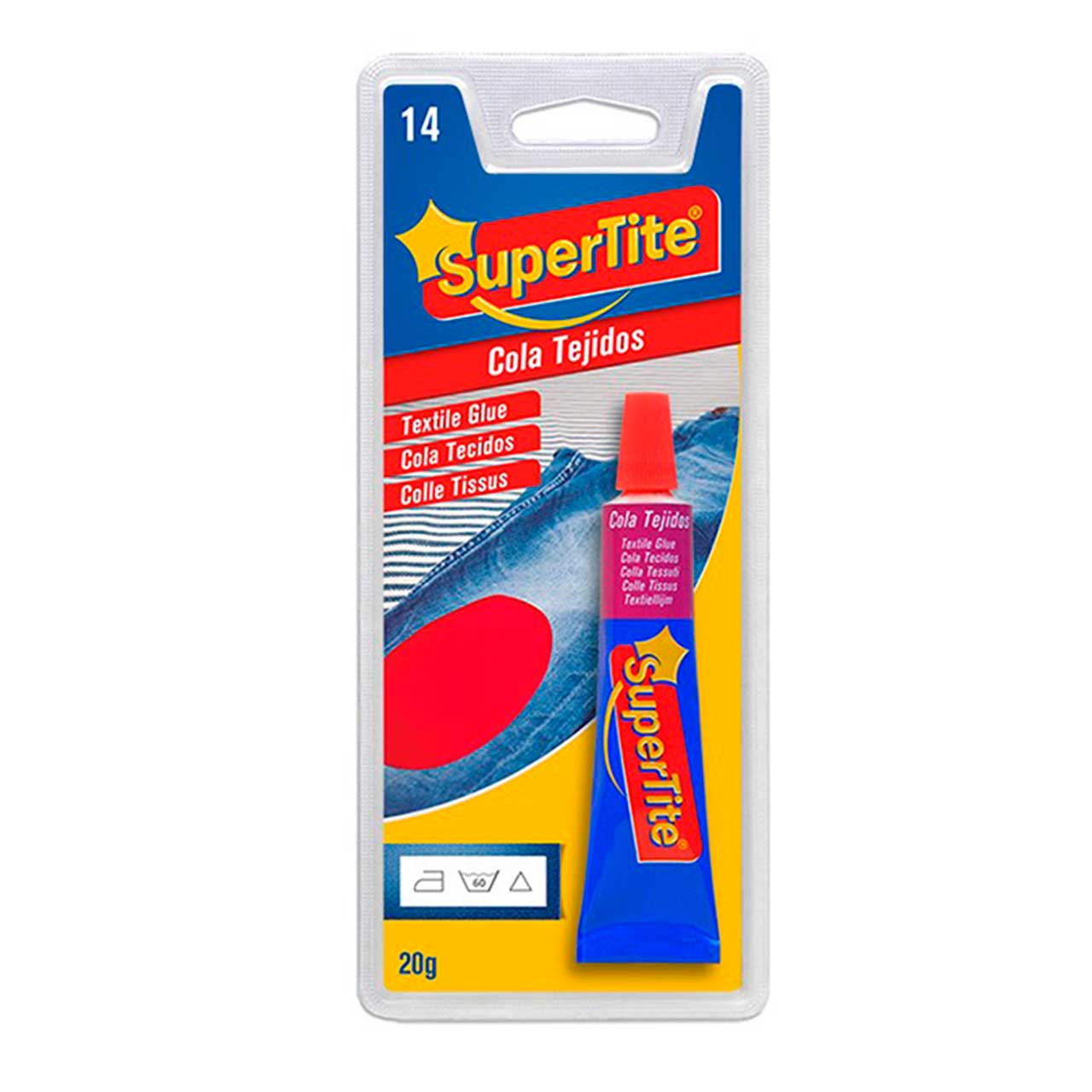 Cola tejidos Supertite 20g. Pega: todo tipo de tejidos entre sí y con otros materiales. Es lavable e incolora. Modo de empleo: Aplicar cola sobre una de las partes a unir y mantenerla presionado 30 segundos. La máxima resistencia se consigue a las 10 horas. Conservar esta etiqueta hasta terminar el producto. Ref: 14