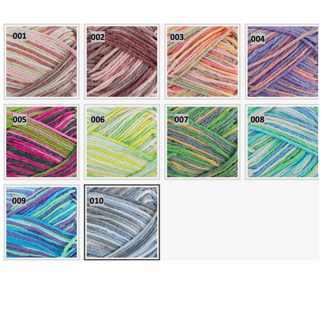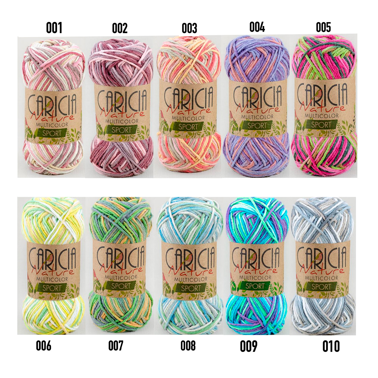 Ovillo Garicia Nature Multicolor sport para tejer con agujas, 100% algodón reciclado 112 m. Aguja de tricotar 4-5 mm – crochet 5-6 mm. Tenemos toda variedad de colores disponibles, utiliza los colores que prefieras y el código que corresponde de Caricia Nature Multicolor Sport