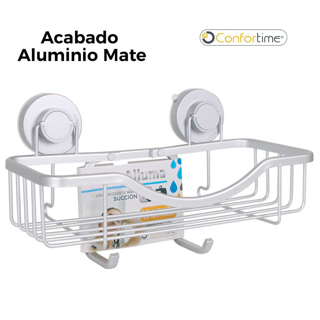 Organizador baño riconera succión acabado aluminio mate y on se oxida, aguanta peso 7kg, la medida ancho-30cm, fondo-13cm.Importado por Confortime.